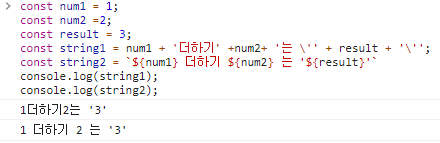 const string2 = `${num1} 더하기 ${num2} 는 '${result}'`