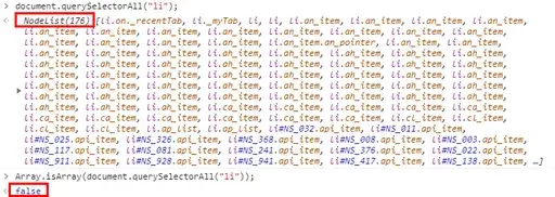 자바스크립트에서 DOM 구조를 이용해 element들을 불러오면, 유사배열이 생기는데요, 아래 이미지는 네이버에서 긁어온 리스트 요소들을 보여주고 있습니다.