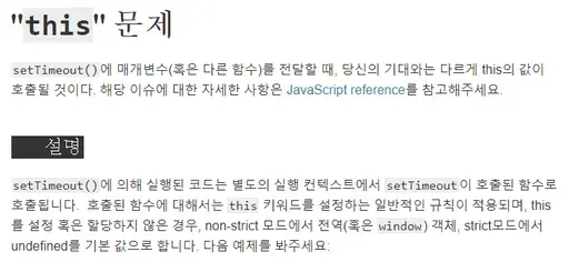 mdn에서는 setTimeout() 메소드의 경우, 별도로 this 키워드를 설정하지 않으면, this를 "window"로 받는다고 설명하고 있습니다. 이 상황을 처리하기 위해 bind를 사용할 수 있습니다.