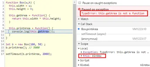 Box라는 생성자 함수를 사용해 b라는 인스턴스를 만들었습니다. 여기서 this는 "b"가 되므로, b.printArea() 값은 5000이 나옵니다. 그런데 setTimeout()에 이 메소드를 넣으면 아래와 같은 에러가 발생합니다.
