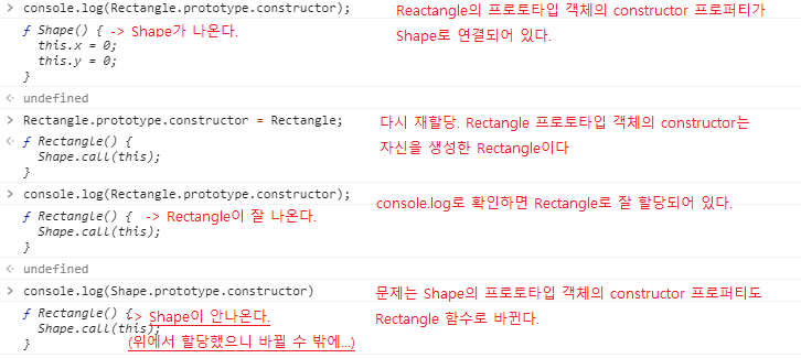- 이 문제를 해결하기 위해 Rectangle 생성자함수로 재 할당 을 한다.그러면 "Shape 프로토타입 객체" 의 constructor 프로퍼티 가Shape 생성자함수 가 아닌 Rectangle 생성자함수 를 가리키게 된다.즉, Shape 생성자함수로 새로운 인스턴스를 만들면,Rectangle 생성자함수로 새로운 객체가 만들어진다.