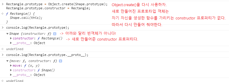 - Object.create()을 사용하지 않으면,Rectangle 프로토타입 객체 의 constructor 프로퍼티 는Rectangle 생성자 함수 가 아닌 Shape 생성자 함수 를 참조한다.즉, Ractangle 생성자함수로 새로운 인스턴스를 만들게 되면,Shape 생성자함수로 새로운 객체가 만들어진다.
