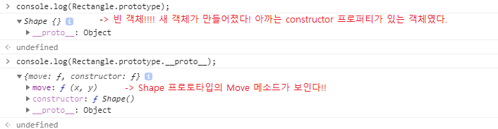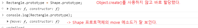 - Object.create() 없이 바로 할당하면,Rectangle의 프로토타입 객체에 Shape 프로토타입 객체가 보인다.즉, Shape 프로토타입 객체의 Move 메소드가 보인다!