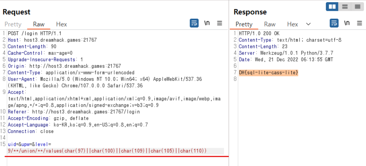 -sql injection을 시도할때는 mysql인지 sqlite인지를 알아야한다. mysql에서 쓰이는 문법이 sqlite에서 사용안될수있는지 이번 문제를 통해 느꼈다.