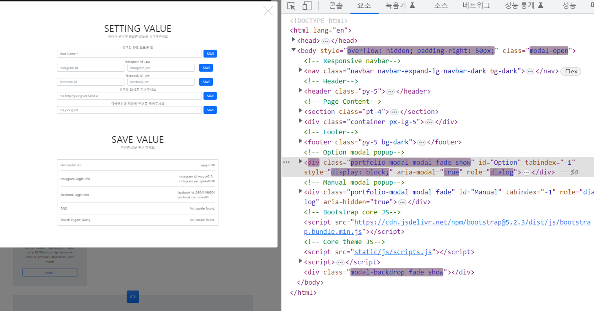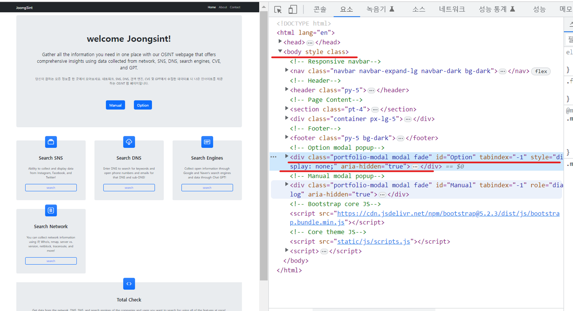 기본적으로 페이지가 시작되면 다음과 같이 display: none 과 aria-hidden="true"가 되어있어 보이지 않고 맨위의 body style class에도 별 특이점이 없다.
