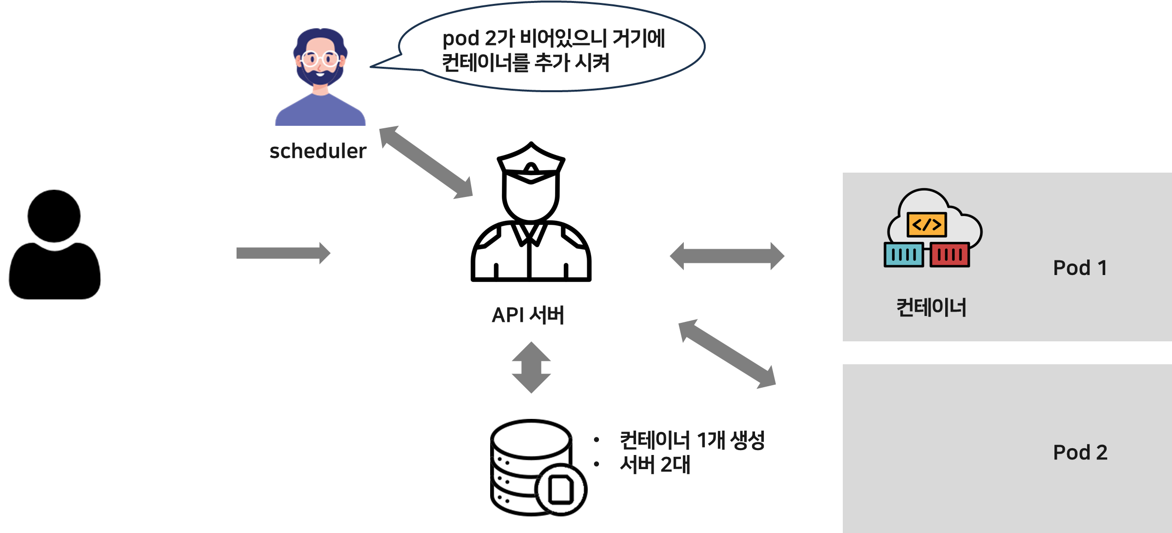 - 이때 스케줄러가 컨테이너를 올릴 pod를 정해주는 역할을 하며, API 서버와 소통하며 명령하게 된다.