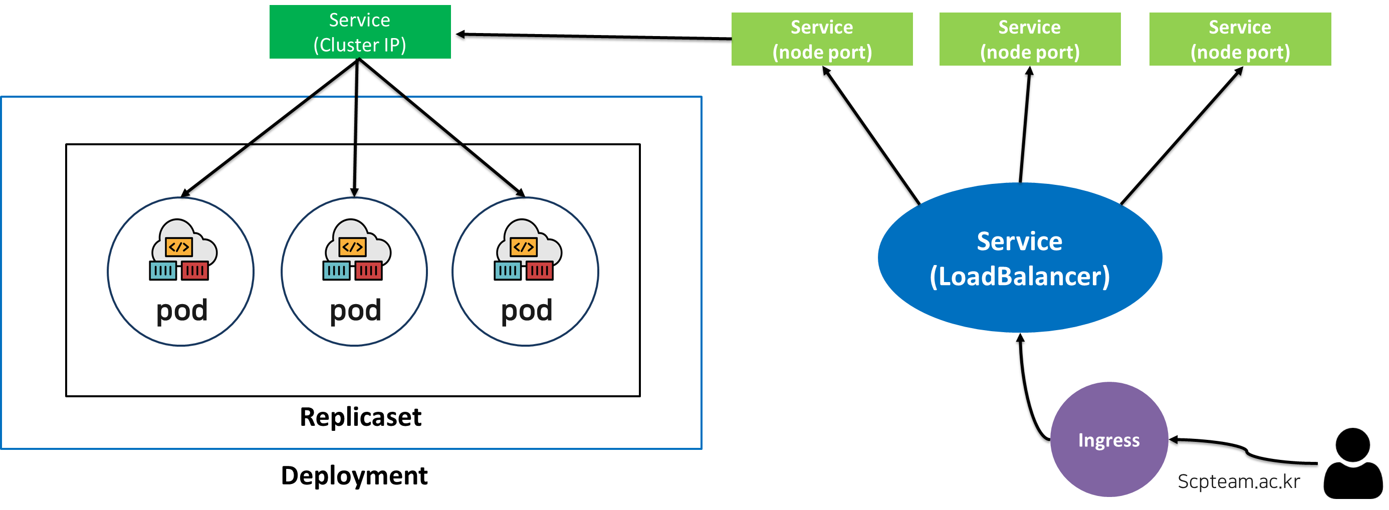 - 쿠버네티스는 여러개의 pod를 생성하며 그 위에 서비스를 올리게 된다. 이때 사용자는 특정 pod를 지정하지 않고 컨테이너를 올리게 되는데 이때 누군가는 어디 pod에 컨테이너를 올릴지 정해줘야한다.