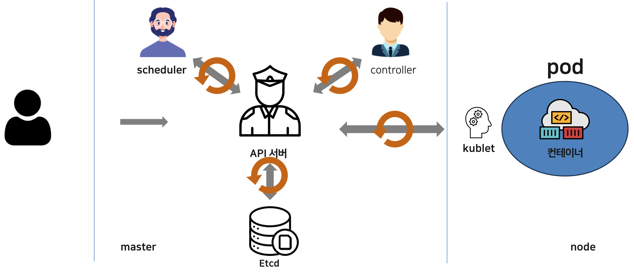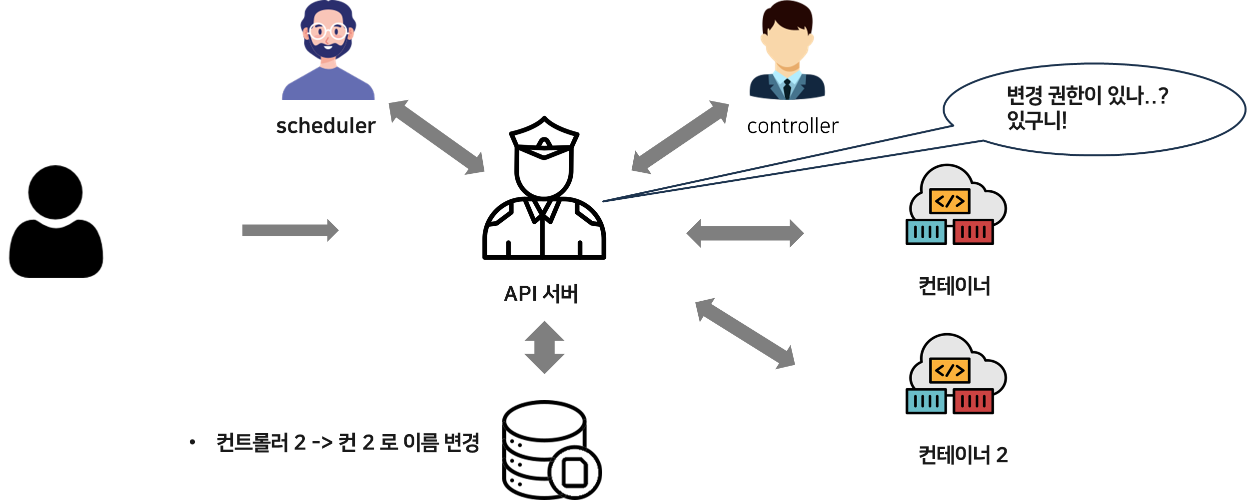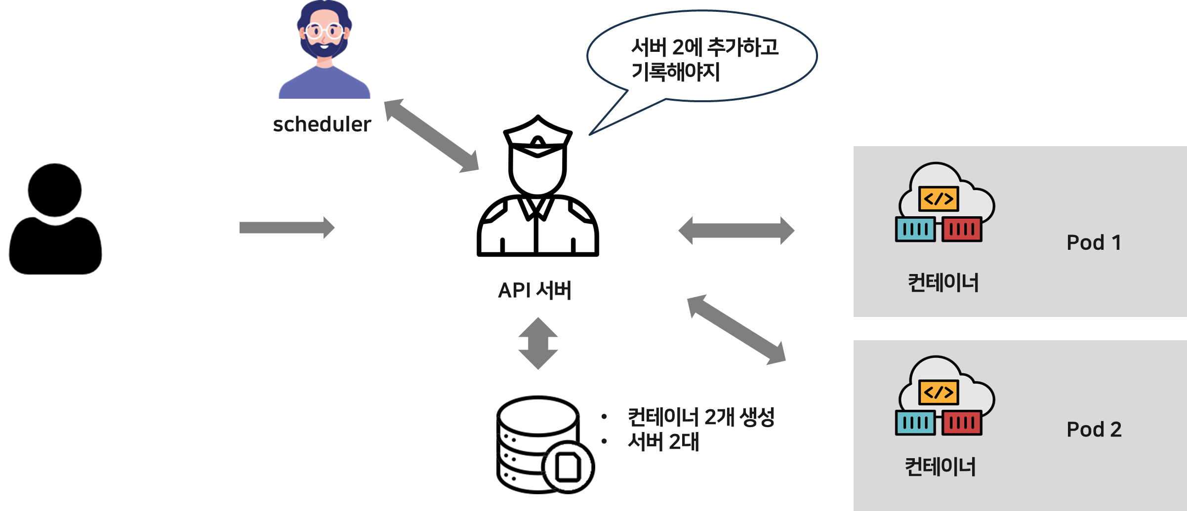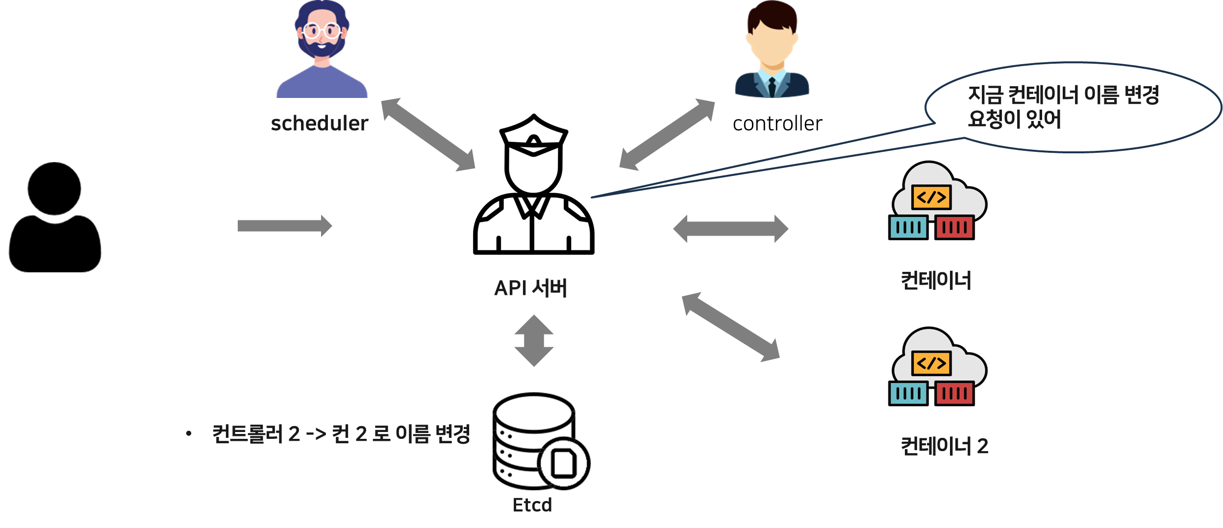 - 사용자의 명령을 받은 API 서버는 행위를 기록하는 etcd에 기록하면서 명령을 수행한다.
