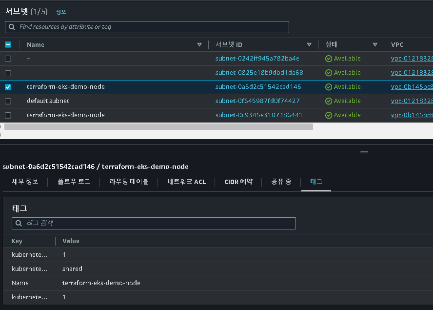 vpc → 서브넷으로간뒤 각 서브넷 태그를 다음과 같이 추가해줬다.