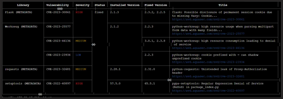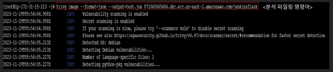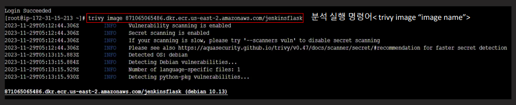 trivy image 871065065486.dkr.ecr.us-east-2.amazonaws.com/jenkinsflask //예시