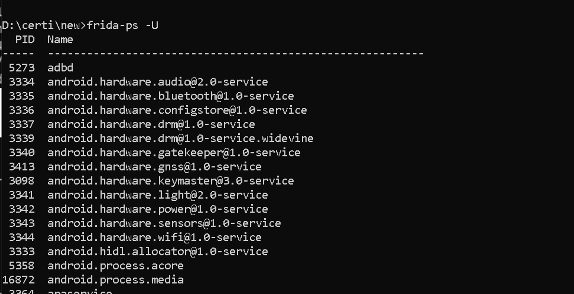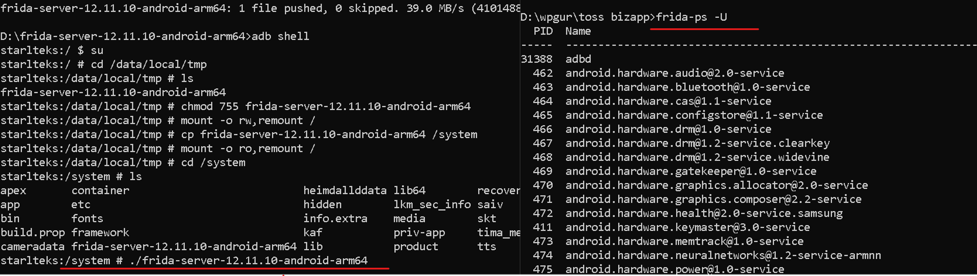 이후 frida 서버를 실행한뒤 frida-ps 로 잘 실행되어있는지 확인한다.