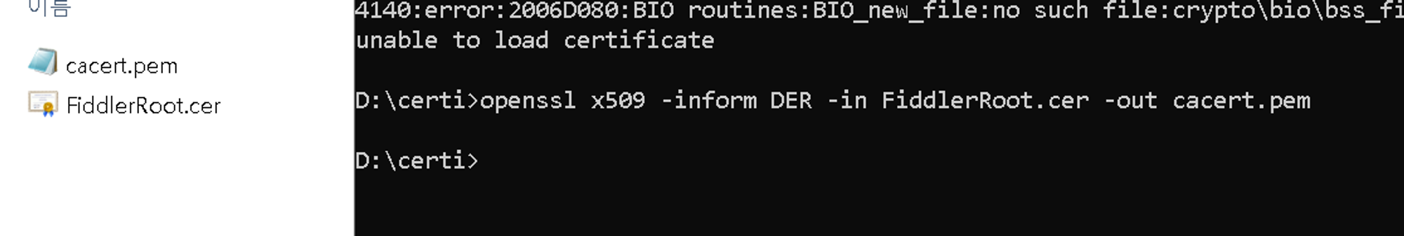 http://ipv4.fiddler:8070/ 이걸로 웹으로 인증서 다운받을 수 있다.