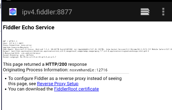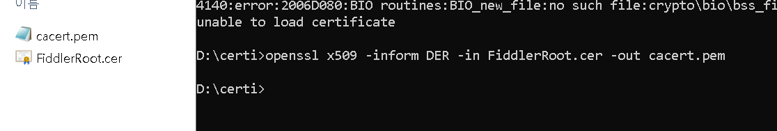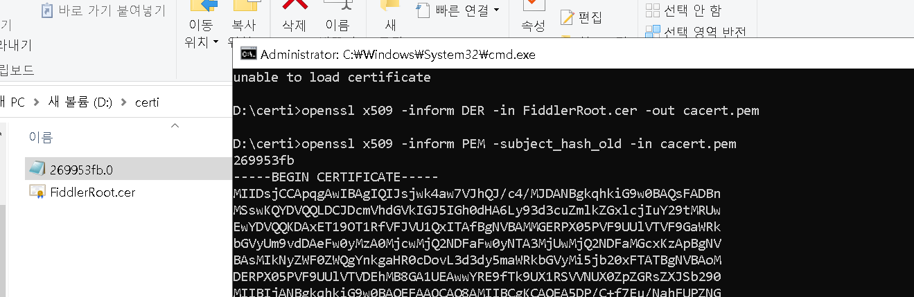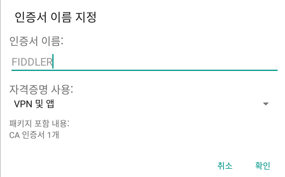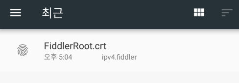 http://ipv4.fiddler:8877/ 로 접근하여 피들러 인증서를 다운받는다.