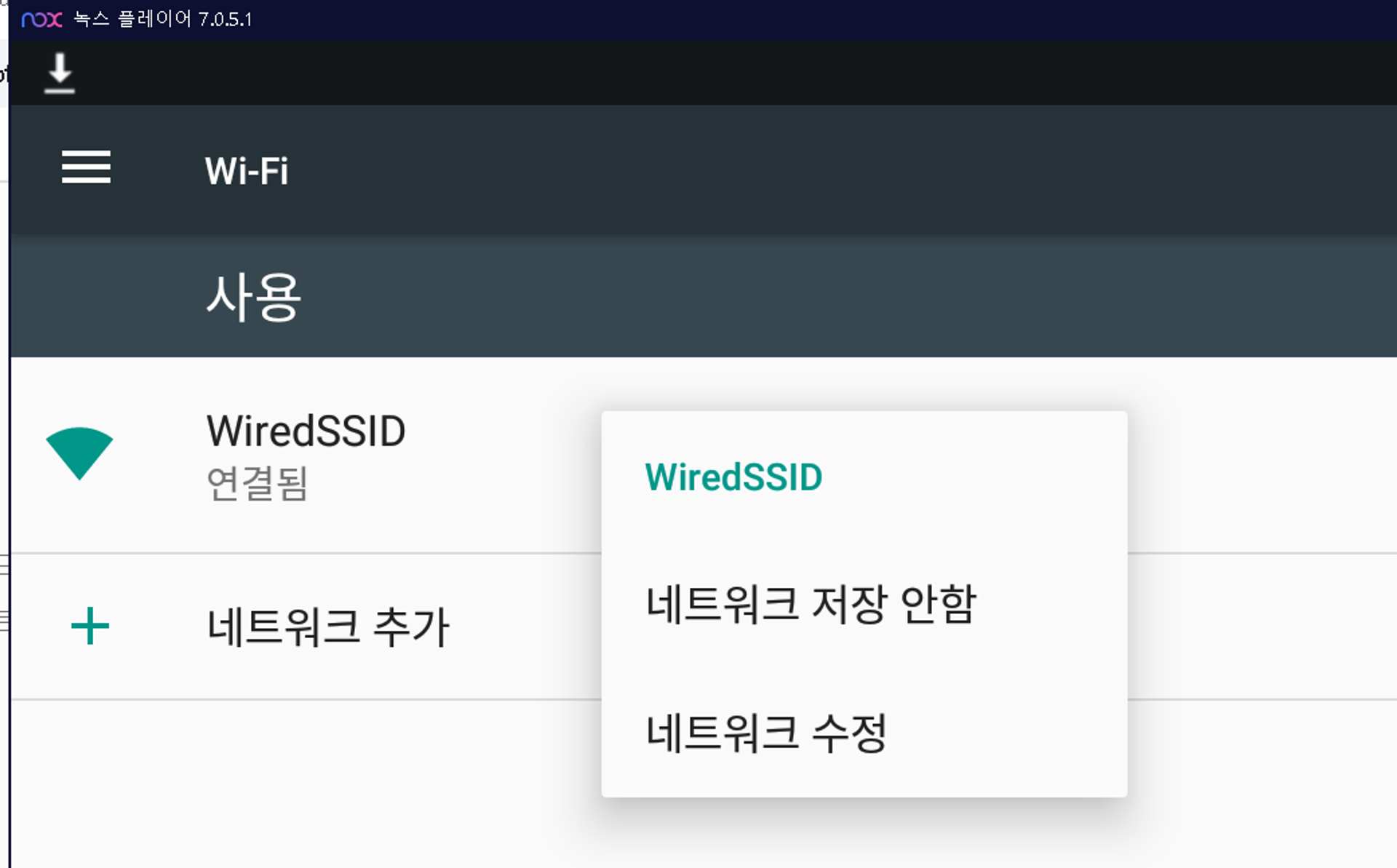 4. 녹스의 네트워크 설정으로 들어간뒤 WiredSSID를 2초정도 누르고 있으면 네트워크 수정 버튼이 생긴다.