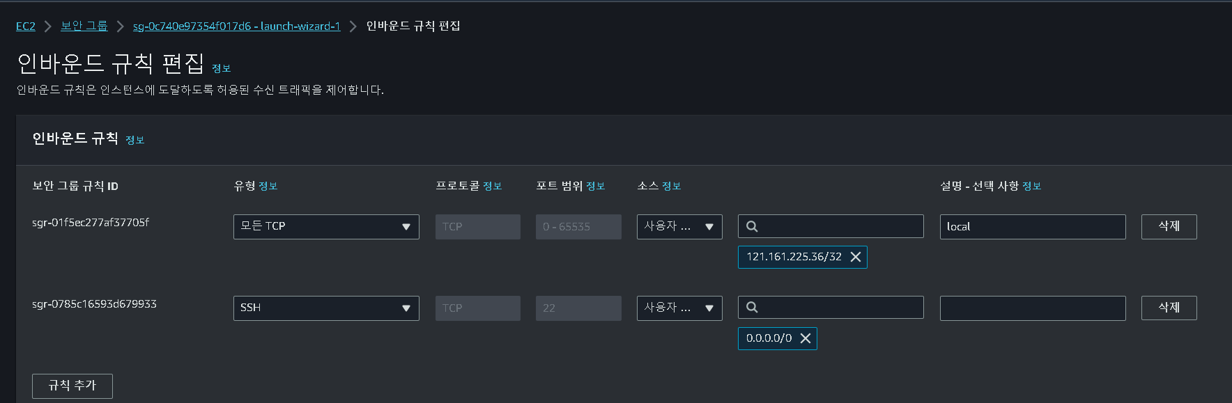 인스턴스에 할당된 보안그룹을 통해 인바운드를 내 ip로 설정해줬다.