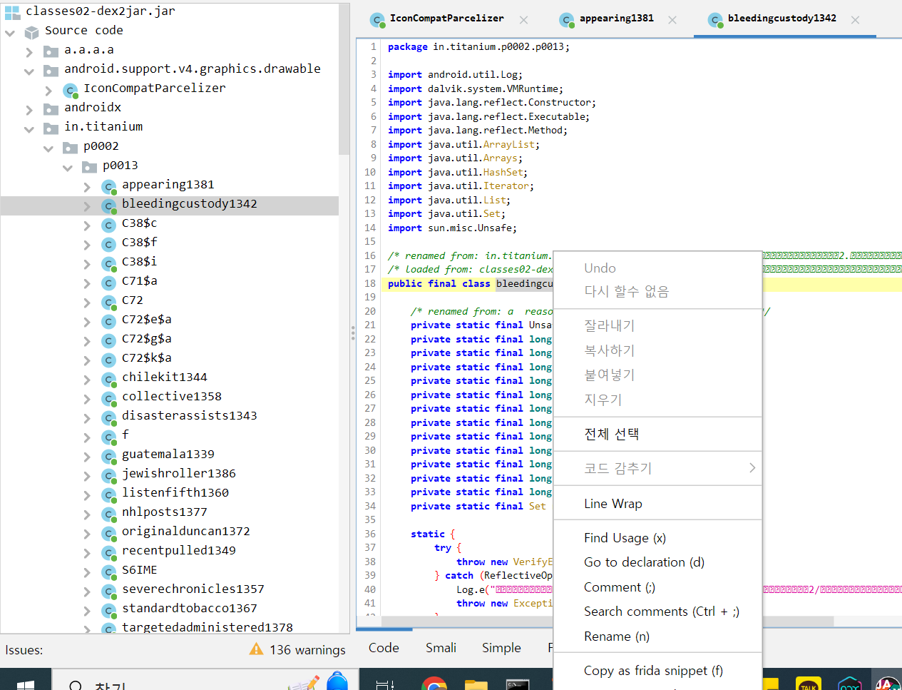 하지만 compile 도중 에러가 발생했고 로그 확인 결과 패키지 이름 및 액티비티 클래스 이름이 올바르지 않을 때 발생하는 오류였다…. 이 악성앱의 특성상 파일 경로가 난독화여서 compile이 안되는거 같다…