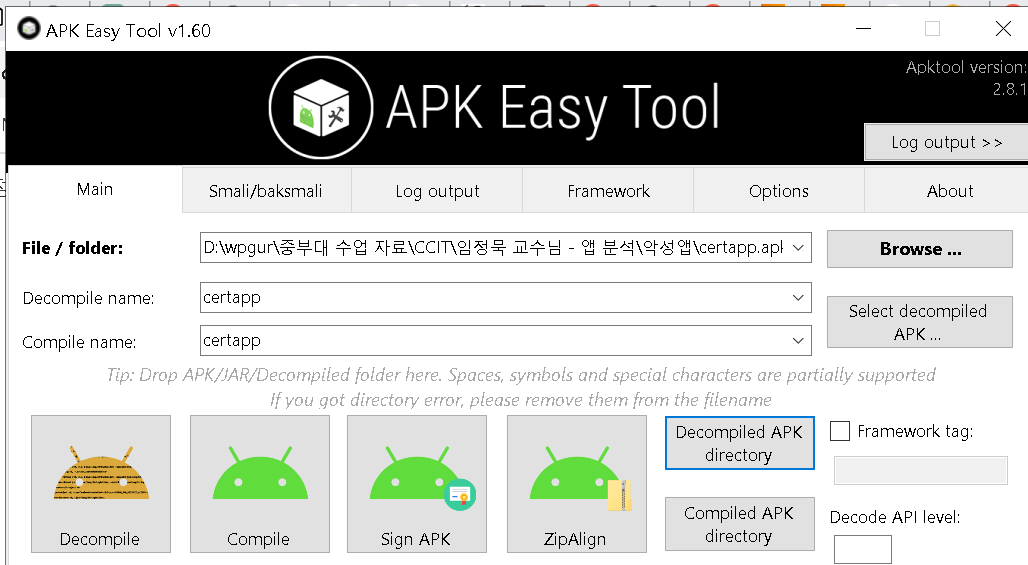 1. 수정을 위해 APK 툴로 악성앱 업로드 이후 DECOMPILE 진행