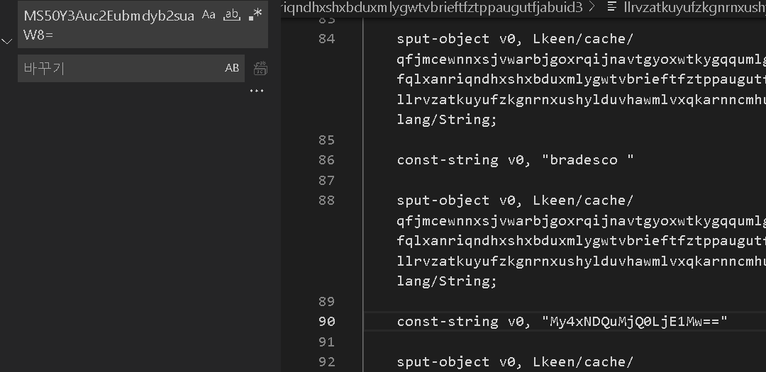 2. 코드 내부에 하드코딩 되어있는경우들이 있어 base64로 인코딩 하여 코드를 찾아봤다