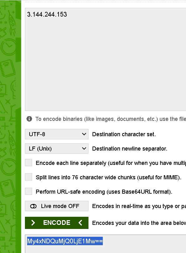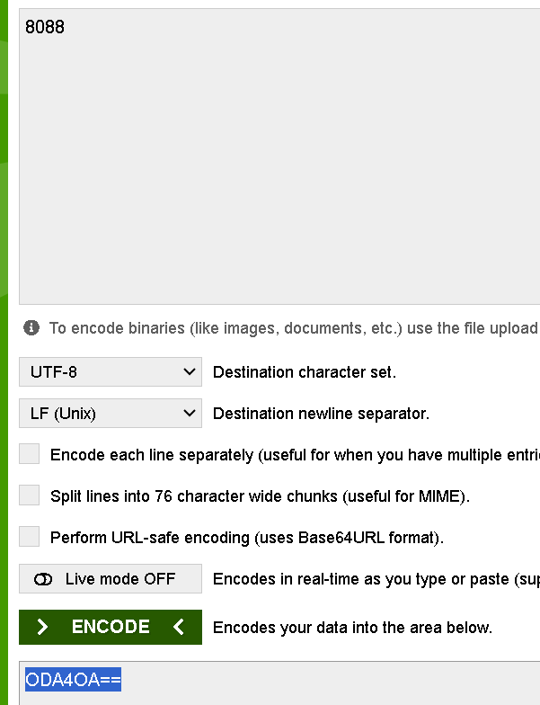 먼저 기존의 포트가 아닌 임의의 포트로 코드를 수정해 주기위해 base64로 인코딩을 진행했다 (8088)