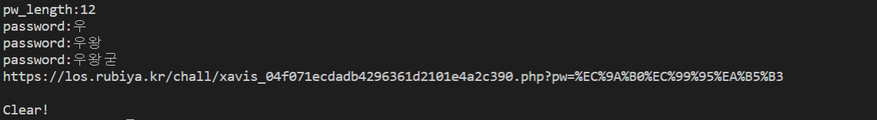 이때 pw의 ascii값이 50000이 넘어가는걸 봐서 한국어 인것을 파악할수 있다 하지만 한국어의 범위는 크기 때문에 이를 잘 구하는것이 핵심이다