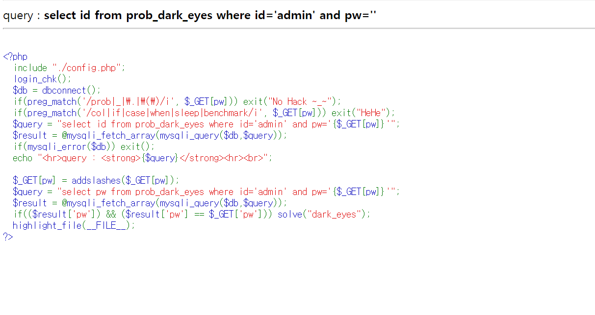 select id from prob_dark_eyes where id='admin' and pw='' or id='admin' and (select 1 union select (1=1))#'