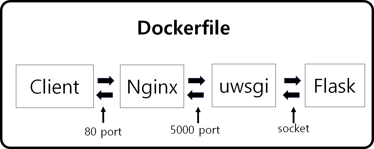 서버를 구축하기위해 Flask(+uwsgi)와 Nginx를 도커로 만들어 준다음 docker compose를 사용해서 하나의 도커로 묶어줘서 다음과 같은 서버를 만들것이다.