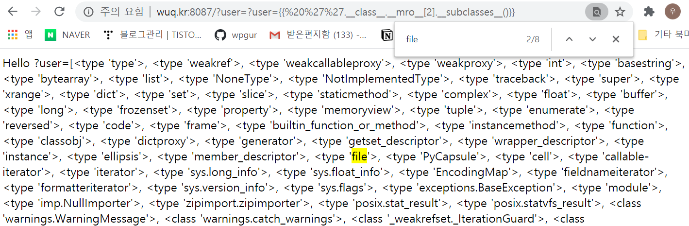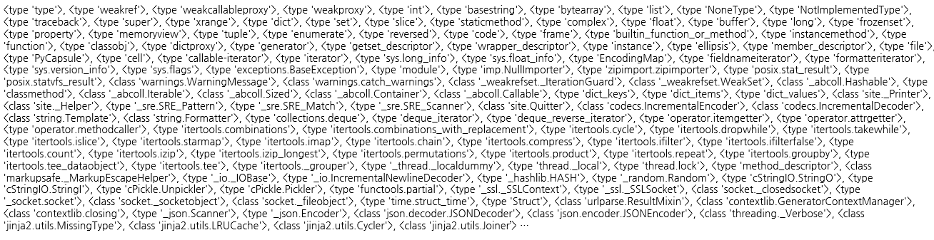 ''는 문자열 이지만 {{ ''.__class__.__mro__ }} 를 출력해보면 3가지가 나온다.